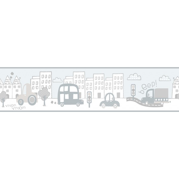 Papel Pintado Cenefa Infantil coches circulando por la ciudad Grises