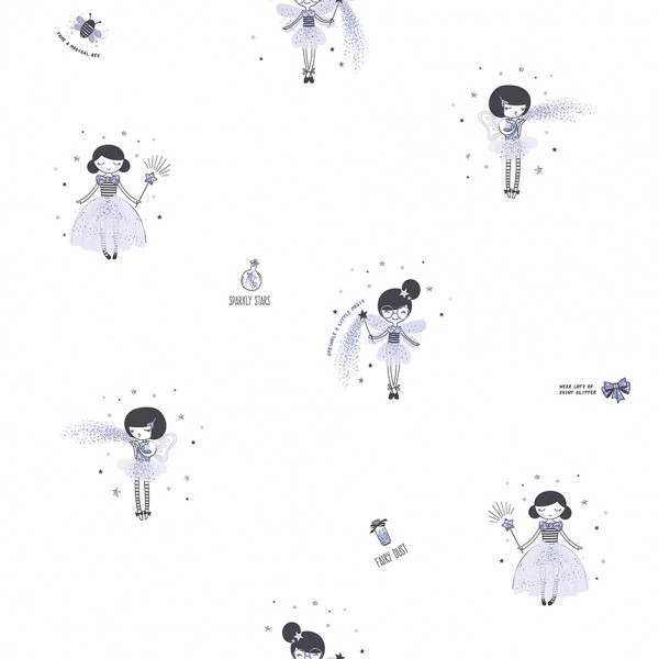 Calidad del Papel Pintado Infantil de hadas en tonos grises con fondo blanco de la colección Sambori: