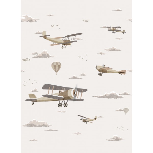 Papel Pintado Mural Infantil de avionetas vintage en tonos beige, de la colección Sambori, para decoración de paredes de habitaciones o dormitorios de niños.