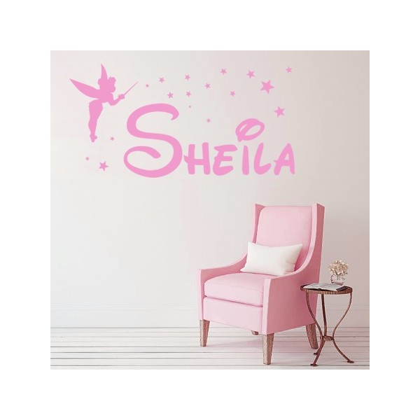 Vinilos decorativos infantiles con el nombre Sheila y con un hada y estrellitas, para decoración de interiores y paredes, recomendado para superficies lisas. Son muy sencillos de colocar, y la colocación es muy limpia y rápida.
