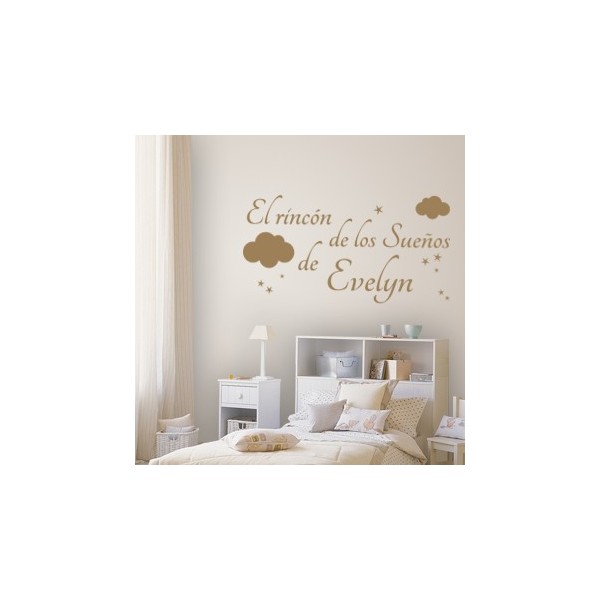 Vinilos decorativos infantiles con la frase "El rincón de los sueños de Evelyn" y con estrellitas y nubes, para decoración de interiores y paredes, recomendado para superficies lisas. Son muy sencillos de colocar, y la colocación es muy limpia y rápida.