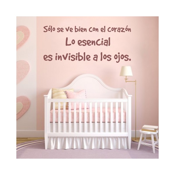 Vinilos infantiles con texto "Sólo se ve bien con el corazón. Lo esencial es invisible a los ojos" para decoración de interiores y paredes, recomendado para superficies lisas. Son muy sencillos de colocar, y la colocación es muy limpia y rápida.