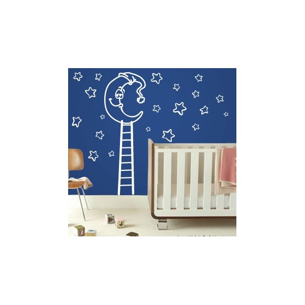 Vinilos decorativos infantiles de escalera que sube a la luna rodeada de estrellas, para decoración de interiores y paredes, recomendado para superficies lisas. Son muy sencillos de colocar, y la colocación es muy limpia y rápida.