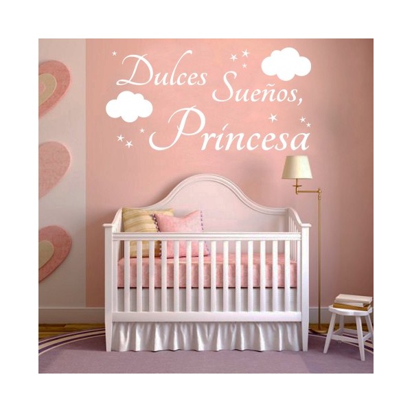 Vinilos decorativos infantiles con la frase "Dulces Sueños, Princesa" con estrellitas y nubes para decoración de paredes de forma original, recomendado para superficies lisas. Son muy sencillos de colocar, y la colocación es muy limpia y rápida.