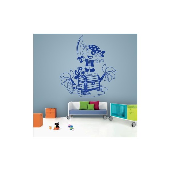 Vinilos decorativos infantiles de niño pirata con cofre del tesoro en una isla para decoración de interiores y paredes, recomendado para superficies lisas. Son muy sencillos de colocar, y la colocación es muy limpia y rápida.