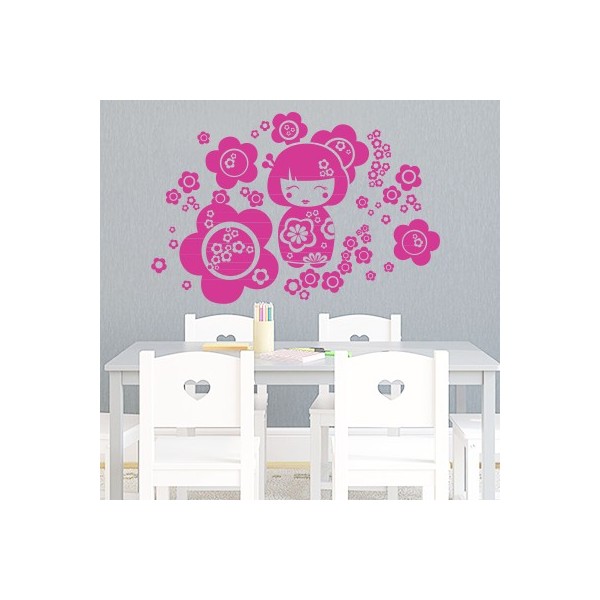 Vinilos decorativos infantiles de niña geisha japonesa con flores para decoración de interiores y paredes, recomendado para superficies lisas. Son muy sencillos de colocar, y la colocación es muy limpia y rápida.