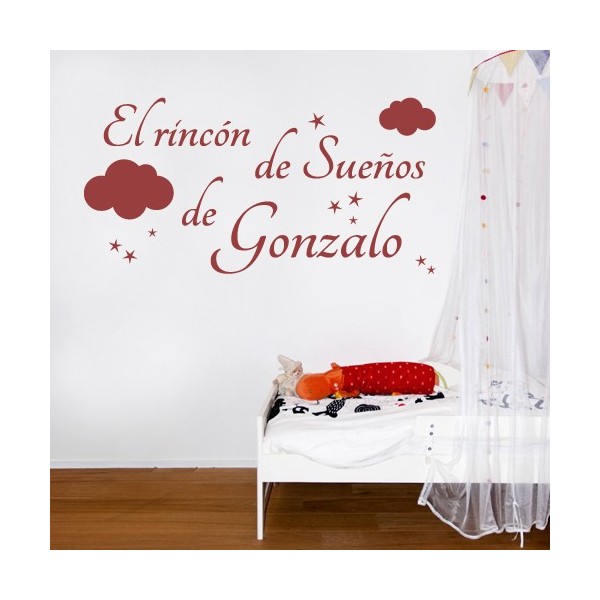 Vinilos decorativos con texto con la frase "El Rincón de Sueños de Gonzalo" para decoracion de paredes de forma original, recomendado para superficies lisas. Son muy sencillos de colocar, y la colocación es muy limpia y rápida.