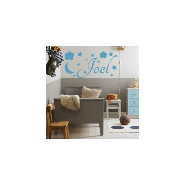 Los pegatinas para paredes infantiles con luna, estrellas y nubes y con el nombre Joel son perfectos para decorar espacios con el nombre Joel. Nos permiten personalizar la decoración y crear ambientes relacionados con el mundo de imaginación y fantasía de los niños.