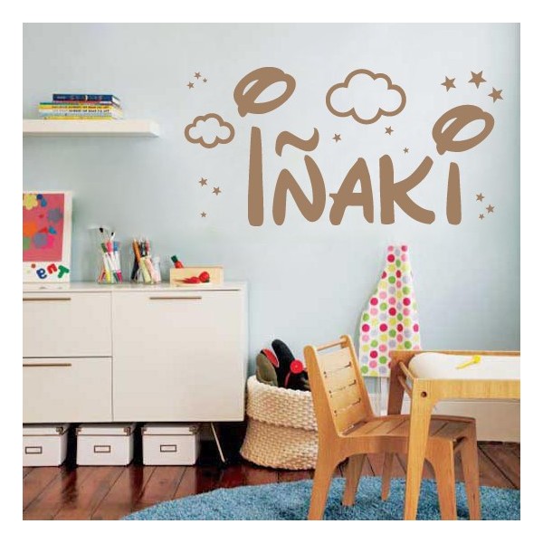 Vinilos decorativos con nombre Iñaki y nubes y estrellitas para decoración de paredes, recomendado para superficies lisas. Son muy sencillos de colocar, y la colocación es muy limpia y rápida.