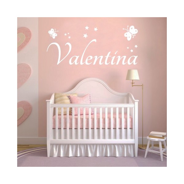 Vinilos decorativos con nombre Valentina y estrellitas y mariposas para decoración de paredes, recomendado para superficies lisas. Son muy sencillos de colocar, y la colocación es muy limpia y rápida.