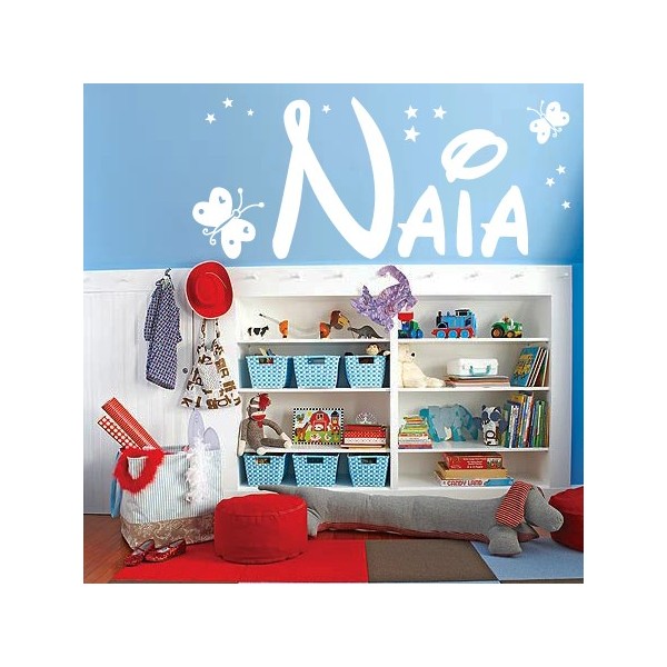 Los pegatinas para paredes infantiles con nombre Naia y estrellitas y mariposas son perfectos para decorar espacios con el nombre Naia. Nos permiten personalizar la decoración y crear ambientes relacionados con el mundo de imaginación y fantasía de los niños.