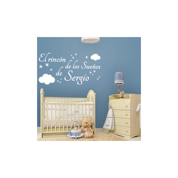 Con estos vinilos decorativos con la frase "El Rincón de los Sueños de Sergio" con estrellas y nubes puedes decorar con un toque especial tus paredes y darles un estilo único y personal.