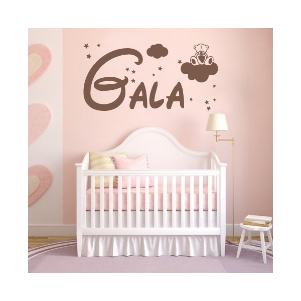 Los colores de los vinilos decorativos infantiles con nombre Gala, estrellitas y un osito sentado sonriendo en una nube que aparecen en está simulación son una aproximación a su color real, varían en función de la calibración de su monitor.