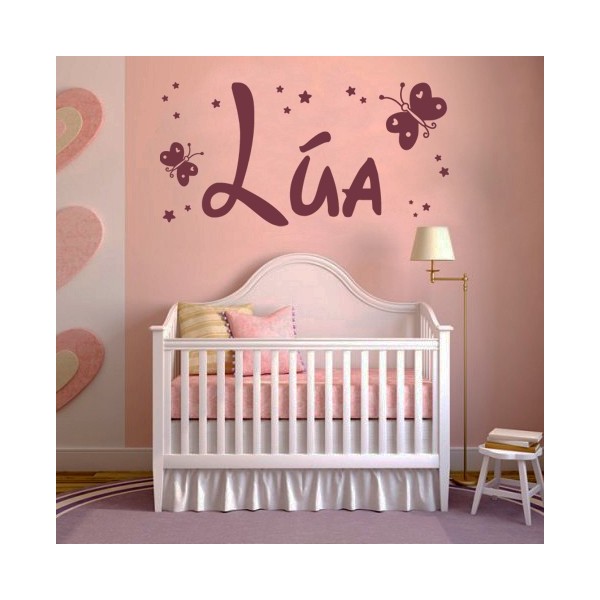 Los colores de los vinilos decorativos infantiles con nombre Lúa con una tipografía de estilo Walt Disney y estrellas y mariposas que aparecen en está simulación son una aproximación a su color real, varían en función de la calibración de su monitor.