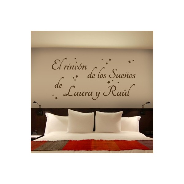 Con estos vinilos decorativos con la frase "El Rincón de los Sueños de Laura y Raúl" con estrellitas puedes decorar con un toque especial tus paredes y darles un estilo único y personal.