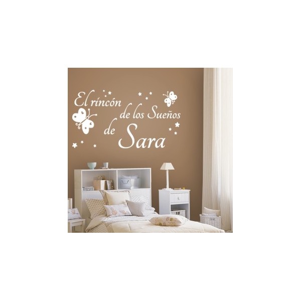Vinilos decorativos con nombres con la frase "El Rincón de los Sueños de Sara" con estrellitas y mariposas para decoración de paredes de forma original, recomendado para superficies lisas. Son muy sencillos de colocar, y la colocación es muy limpia y rápida.