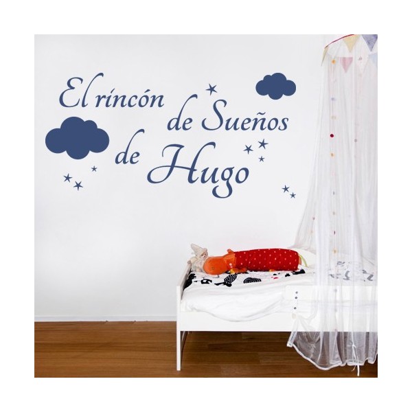 Vinilos decorativos con nombres con la frase "El Rincón de los Sueños de Hugo" con estrellitas y nubes para decoración de paredes de forma original, recomendado para superficies lisas. Son muy sencillos de colocar, y la colocación es muy limpia y rápida.