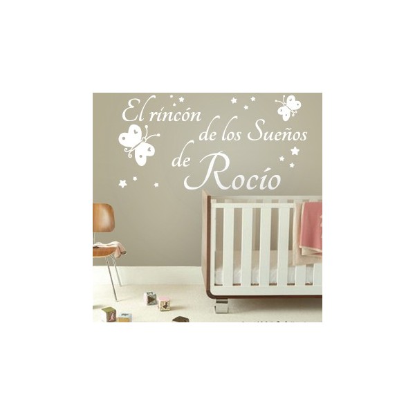 Vinilos infantiles decorativos con la frase "El Rincón de los Sueños de Rocío" para decoración de paredes, recomendado para superficies lisas. Son muy sencillos de colocar, y la colocación es muy limpia y rápida.