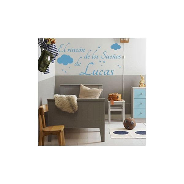 Vinilos decorativos infantiles con la frase "El rincón de los Sueños de Lucas" y con estrellitas y nubes, para decoracion de interiores y paredes, recomendado para superficies lisas. Son muy sencillos de colocar, y la colocación es muy limpia y rápida.