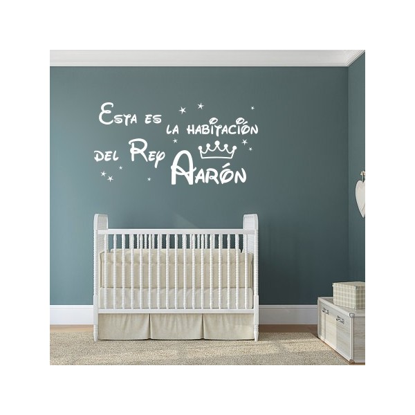 Vinilos decorativos infantiles con la frase "Esta es la habitación del Rey Aarón" con estrellitas y una corona, para decoración de interiores y paredes, recomendado para superficies lisas. Son muy sencillos de colocar, y la colocación es muy limpia y rápida.