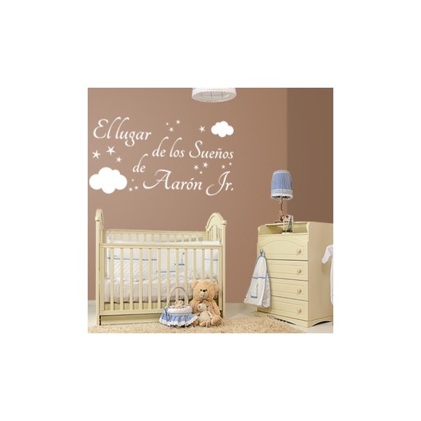 Vinilos decorativos infantiles con la frase "El Lugar de los Sueños de Aarón Jr." y con estrellitas y nubes, para decoración de interiores y paredes, recomendado para superficies lisas. Son muy sencillos de colocar, y la colocación es muy limpia y rápida.