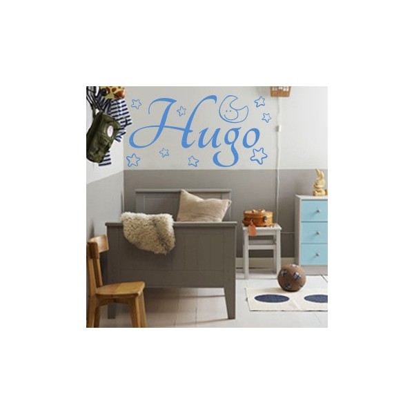 Vinilos decorativos infantiles con el nombre Hugo y con luna y estrellitas para decoración de paredes de forma original, recomendado para superficies lisas. Son muy sencillos de colocar, y la colocación es muy limpia y rápida.