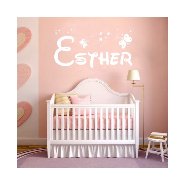 Pegatinas para paredes infantiles con nombre Esther en tipografía Walt Disney con mariposas y estrellas, para decoración de interiores y paredes, recomendado para superficies lisas. Son muy sencillos de colocar, y la colocación es muy limpia y rápida.