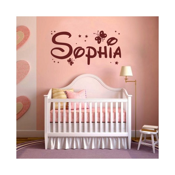 Pegatinas para paredes infantiles con nombre Sophia en tipografía Walt Disney con mariposas y estrellas, para decoración de interiores y paredes, recomendado para superficies lisas. Son muy sencillos de colocar, y la colocación es muy limpia y rápida.