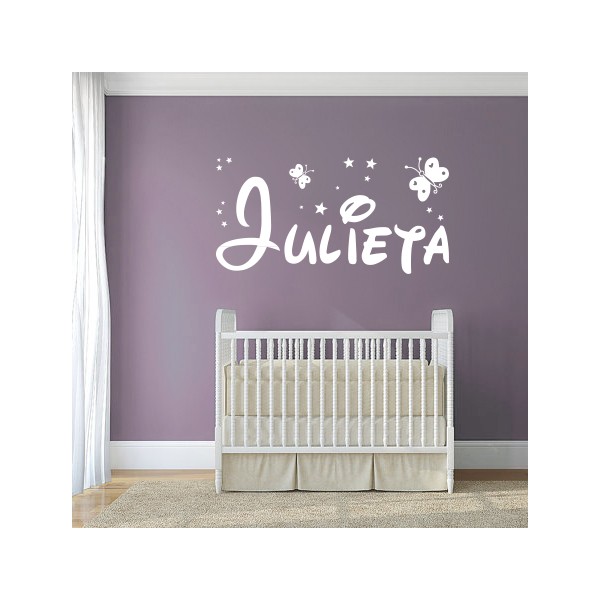 Los colores de los vinilos decorativos infantiles con nombre Julieta con tipo de letra Disney, estrellitas y mariposas que aparecen en está simulación son una aproximación a su color real, varían en función de la calibración de su monitor.