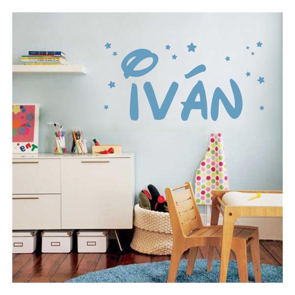 Pegatinas para paredes infantiles con nombre Iván y estrellitas en tipografía Walt Disney, para decoración de interiores y paredes, recomendado para superficies lisas. Son muy sencillos de colocar, y la colocación es muy limpia y rápida.