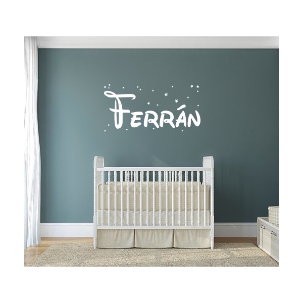 Pegatina de pared con nombre Ferrán con estrellitas para paredes, con tipo de letra estilo Disney para decoración infantil. Vinilo decorativo o sticker adhesivo con nombre Ferrán y estrellas para decoración de pared.