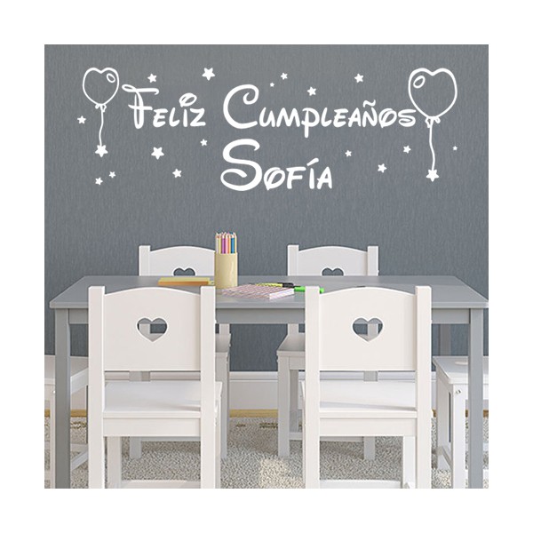 Los vinilos de texto con la frase Feliz Cumpleaños, Sofía con globos y estrellitas son una muy buena opción para decorar paredes en cumpleaños. Se pueden colocar sobre una pizarra, un cuadro, un panel liso o sobre cualquier pared o cristal.