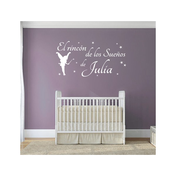 El hada y las estrellas van en un color, el texto "El Rincón de los Sueños de Julia" va en otro color. El color de la frase será el color seleccionado para el vinilo. El color del hada y las estrellas hay que indicarlo en el mensaje de observaciones del pedido.