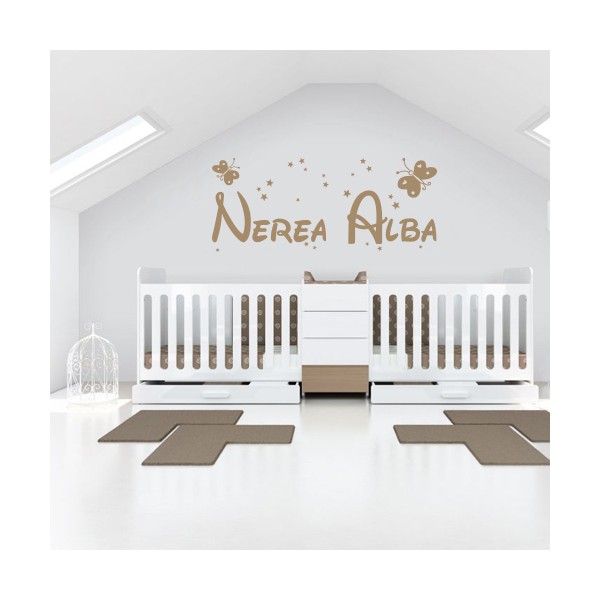 Los colores de los vinilos decorativos infantiles con nombres Nerea y Alba con estrellitas y mariposas que aparecen en está simulación son una aproximación a su color real, varían en función de la calibración de su monitor.