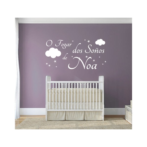 Vinilos decorativos infantiles con la frase en gallego "O Fogar dos Soños de Noa", con estrellitas y nubes, para decoración de interiores y paredes, recomendado para superficies lisas. Son muy sencillos de colocar, y la colocación es muy limpia y rápida.