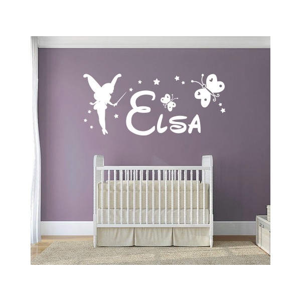 Pegatinas de paredes con nombre Elsa y con un hada, mariposas y estrellitas para decoración de paredes, recomendado para superficies lisas. Son muy sencillos de colocar, y la colocación es muy limpia y rápida.
