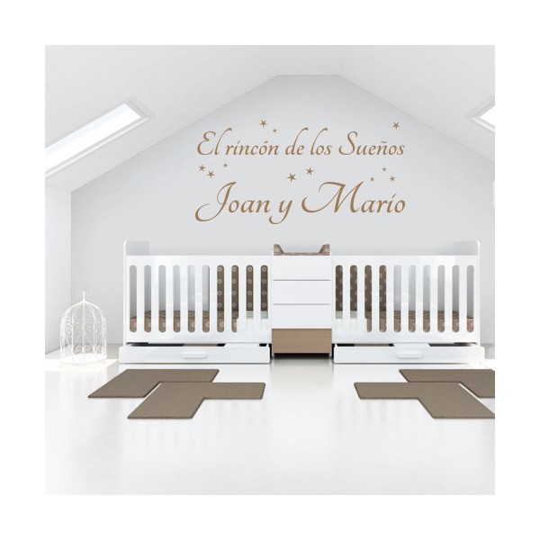 Vinilos decorativos con nombres con la frase "El Rincón de los Sueños Joan y Mario" con estrellas para decoración de paredes de forma original, recomendado para superficies lisas. Son muy sencillos de colocar, y la colocación es muy limpia y rápida.
