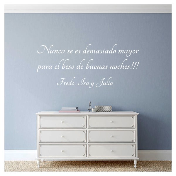 Vinilos decorativos infantiles con la frase "Nunca se es demasiado mayor para el beso de buenas noches!!!", con tres nombres, para decoración de interiores y paredes, recomendado para superficies lisas. Son muy sencillos de colocar, y la colocación es muy limpia y rápida.