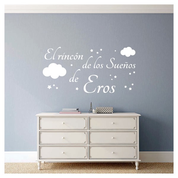 Vinilos decorativos infantiles con la frase "El Rincón de los Sueños de Eros", con estrellitas y nubes, para decoración de interiores y paredes, recomendado para superficies lisas. Son muy sencillos de colocar, y la colocación es muy limpia y rápida.