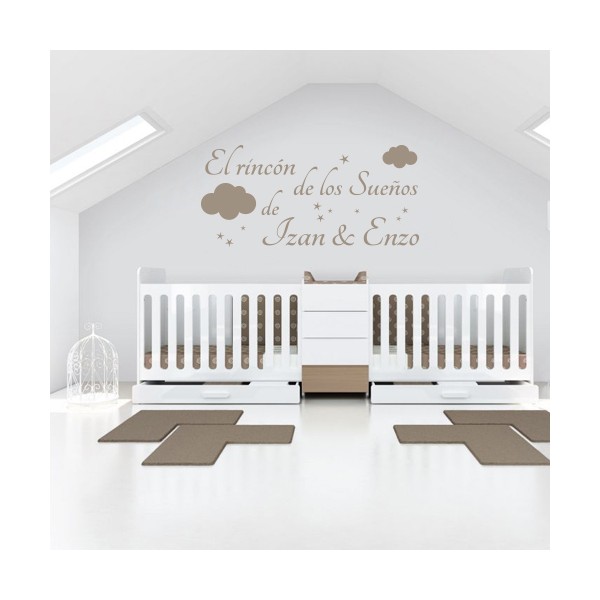 Vinilos decorativos infantiles con la frase "El Rincón de los Sueños de Izan y Enzo", con estrellitas y nubes, para decoración de interiores y paredes, recomendado para superficies lisas. Son muy sencillos de colocar, y la colocación es muy limpia y rápida.