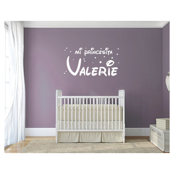 Vinilos decorativos de Mi princesita Valerie estilo Disney con estrellitas para decoración de paredes de forma original, recomendado para superficies lisas. Son muy sencillos de colocar, y la colocación es muy limpia y rápida.