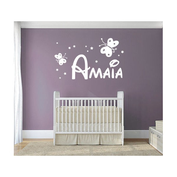 Vinilos decorativos con nombre Amaia y con estrellitas y mariposas para decoracion de interiores y paredes, recomendado para superficies lisas. Son muy sencillos de colocar, y la colocación es muy limpia y rápida.