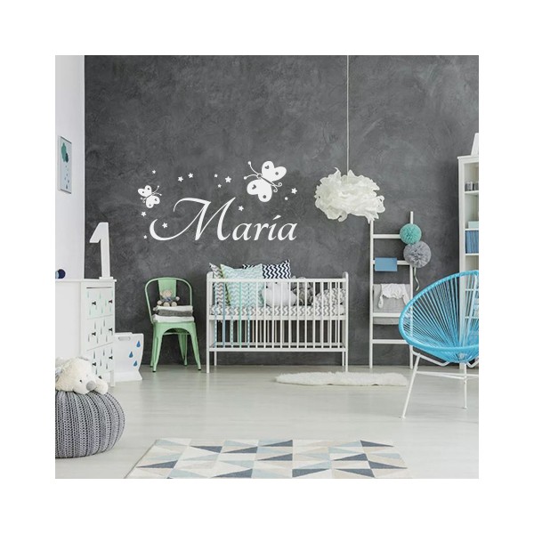 Con los vinilos con nombre María con estrellitas y mariposas puedes añadir un nombre personalizado a tu pared y crear un ambiente único y original.