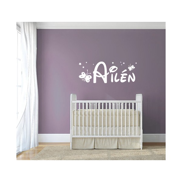 Vinilos decorativos para decoracion de interiores con el nombre Ailén con mariposas y estrellas, recomendado para superficies lisas. Son muy sencillos de colocar, y la colocación es muy limpia y rápida.