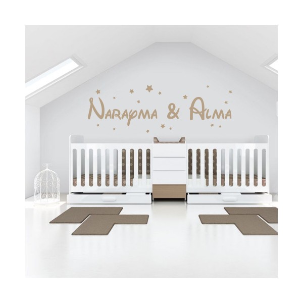 Los colores de los vinilos decorativos infantiles con los nombres Narayma y Alma en tipo de letra estilo Disney y con estrellitas que aparecen en está simulación son una aproximación a su color real, varían en función de la calibración de su monitor.