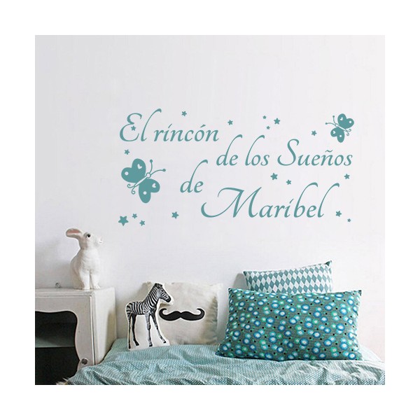 Vinilos decorativos infantiles con la frase "El Rincón de los Sueños de Maribel", con estrellitas y mariposas, para decoración de interiores y paredes, recomendado para superficies lisas. Son muy sencillos de colocar, y la colocación es muy limpia y rápida.