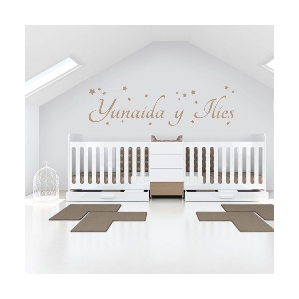 Los colores de los vinilos decorativos infantiles con los nombres Yunaida y Ilies y con estrellitas que aparecen en está simulación son una aproximación a su color real, varían en función de la calibración de su monitor.