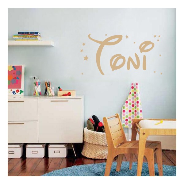 Vinilos decorativos para decoración de interiores con el nombre Toni con estilo de letra Disney y estrellitas, recomendado para superficies lisas. Son muy sencillos de colocar, y la colocación es muy limpia y rápida.