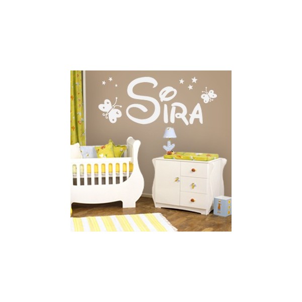 Vinilos decorativos con nombre Sira, estrellitas y mariposas para decoracion de interiores, recomendado para superficies lisas. Son muy sencillos de colocar, y la colocación es muy limpia y rápida.