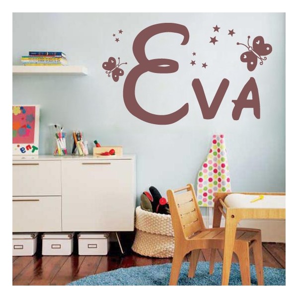 Vinilos decorativos con nombre Eva con mariposas y estrellitas para decoracion de interiores, recomendado para superficies lisas. Son muy sencillos de colocar, y la colocación es muy limpia y rápida.